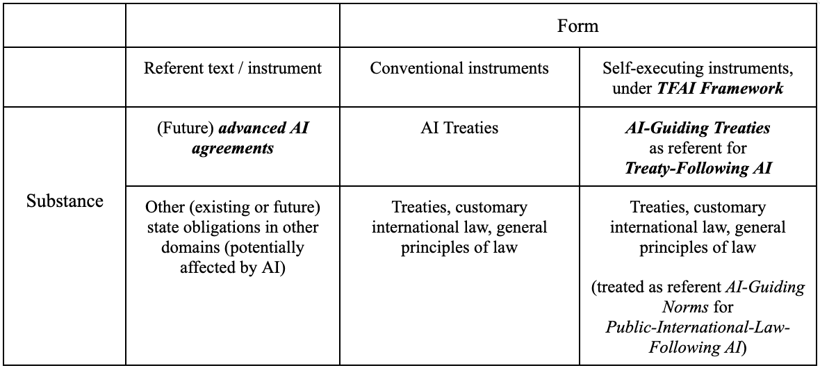 As such, AI-Guiding Treaties demonstrate a high-leverage mechanism for self-executing state commitments. This mechanism could in principle be extended to all sorts of other treaties, in any other domains—from cyberwarfare to alliance security guarantees, from bilateral trade agreements to export control regimes, and even human rights or environmental law regimes—where AI agents could become involved in carrying out large fractions of their deploying states’ conduct. However, for the present, we focus on applying the TFAI framework to bespoke AI-guiding treaties (see Table 1) and leave this question of how to configure AI agents to follow other (non-AI-specific) legal obligations to future work. After all, if the TFAI framework cannot operate in this more circumscribed context, it will likely also fall flat in the context of other international legal norms and instruments. Conversely, if it does work in this narrow context, it could still be a valuable commitment mechanism for state coordination around advanced AI, even if it would not solve the problems of AI’s actions in other domains of international law.
